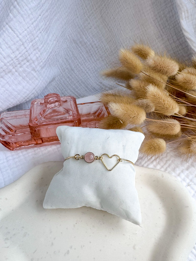 Jonc en Gold Filled de haute qualité, orné d’un cœur et d’une pierre naturelle de quartz rose sertie à la main.