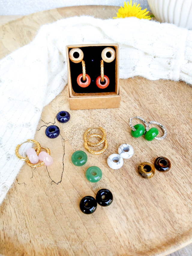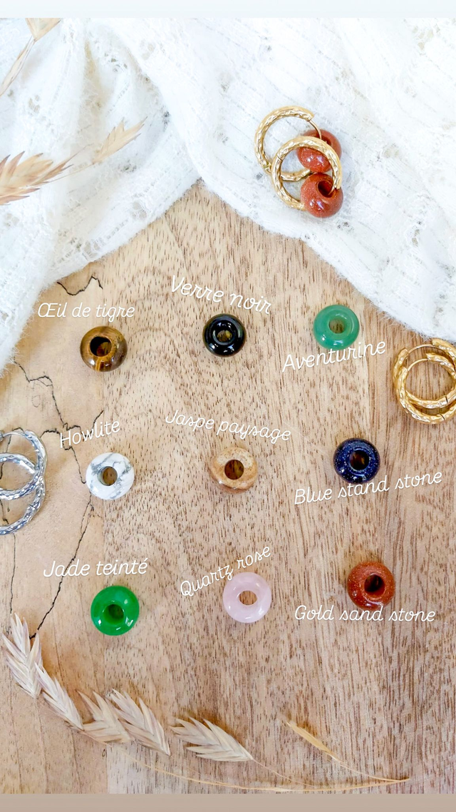 - Œil de tigre, Aventurine, Howlite, Jaspe paysage, Quartz rose, Jade verte teintée, Obsidienne noire, Unakite vert corail, Jade jaune.
